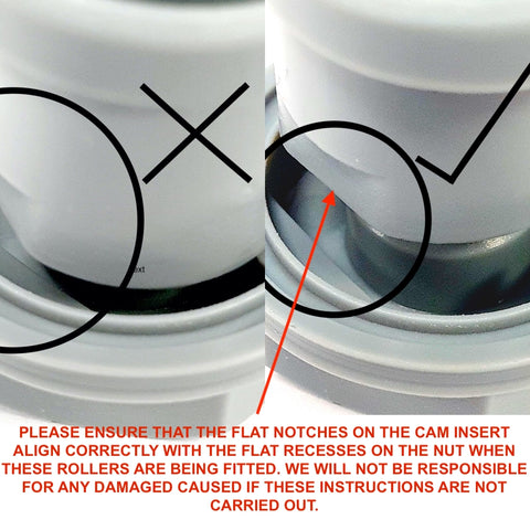 - PLEASE ENSURE THAT THE FLAT NOTCHES ON THE CAM INSERT ALIGN CORRECTLY WITH THE FLAT RECESSES ON THE NUT WHEN THESE ROLLERS ARE BEING FITTED. WE WILL NOT BE RESPONSIBLE FOR ANY DAMAGED CAUSED IF THESE INSTRUCTIONS ARE NOT CARRIED OUT.